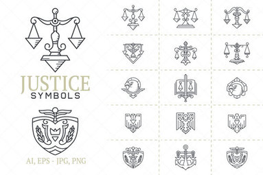 A set of 15 justice symbols: libra (scale), eagle, sword, book, anchor.